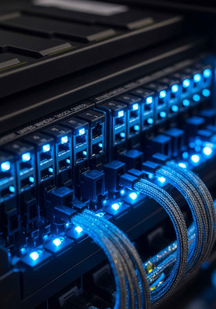 Network cables in a data center connect servers with LED lights for fast and efficient data communication