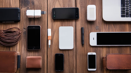 Flat lay image of charging devices for smartphones, laptops, and gadgets, conveying convenience and innovation, perfect for charging device manufacturers.
