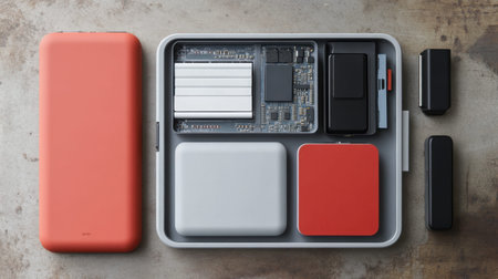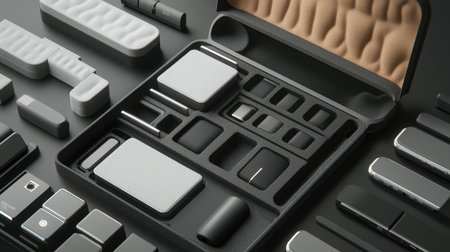 This image showcases a modern tech organizer designed for storing gadgets and accessories, featuring a stylish arrangement of compact containers on a textured surface.