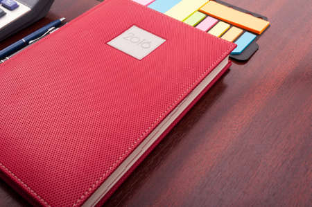 Close-up of notebook planner and sticky notes as pov and professional workspace concept