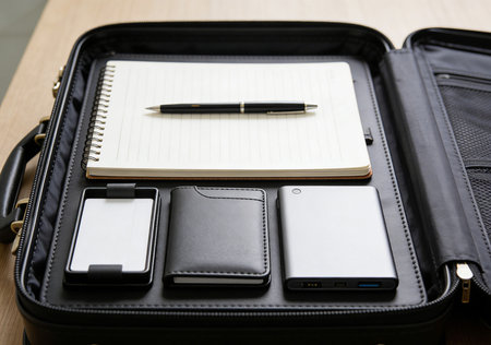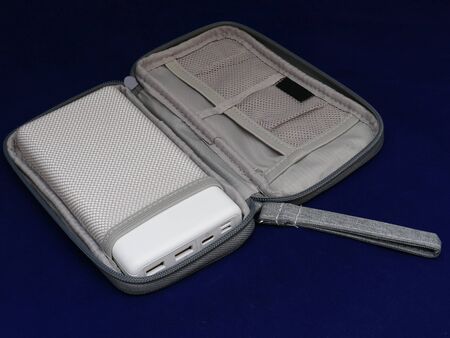 Charging devices in a tech pouch on desk, organized travel digital lifestyle gear setup with neutral background