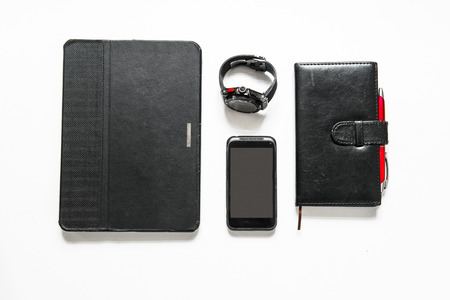 Composition with modern smart watch, mobile phone and notebooks on dark background