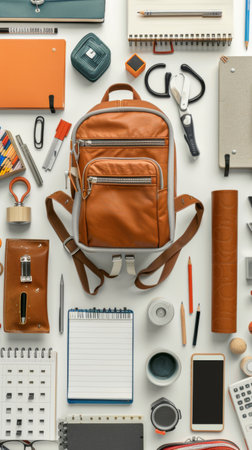 Amidst a vibrant array of stationery and tools, a stylish brown backpack rests at the center, surrounded by notebooks, pens, and creative accessories, inviting inspiration and productivity.