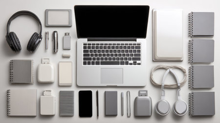 A well-organized workspace featuring a laptop, cables, and various tech accessories. This flatlay captures a minimalistic approach to productivity and creativity.