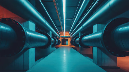 Captivating view of an industrial corridor showcasing large pipes and dramatic lighting. The contrasting blue and orange tones enhance the modern design and atmosphere.