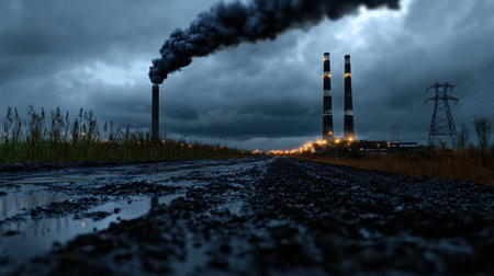 Dense smoke rises from factory chimneys as twilight falls, illuminating the industrial landscape with a moody ambiance and subtle lights.