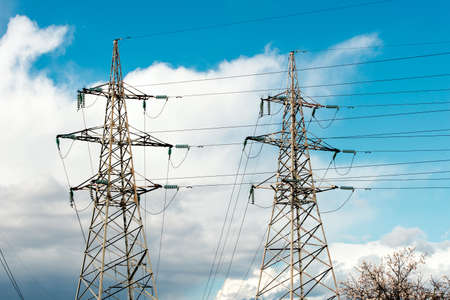 Renewable energy concept. Electric tower with a background of clouds and blue sky.