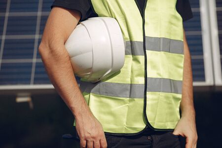 Man in a white helmet near a solar panel