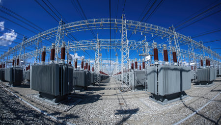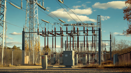 A vast electric substation featuring high voltage equipment under a clear blue sky. The image showcases the essential infrastructure for energy distribution and management.