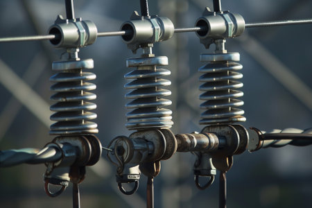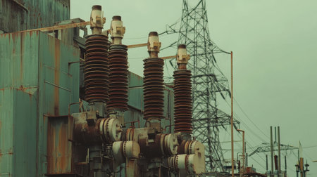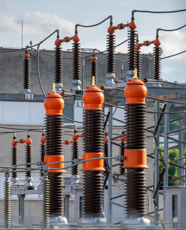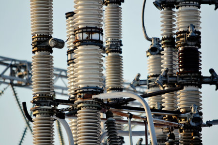 This close-up image showcases electrical insulators in a substation, highlighting essential industrial elements for high voltage equipment and emphasizing safety and reliability in energy transmission.
