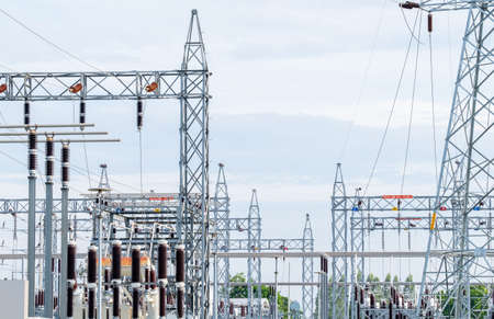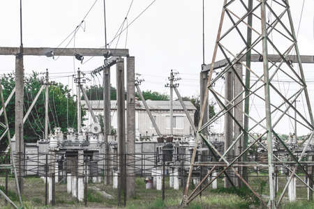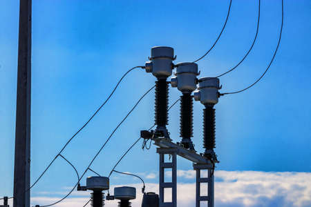 High voltage switch. High voltage electrical transformer substation. Power station. Power line.