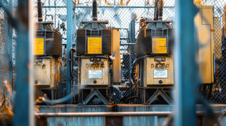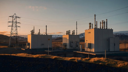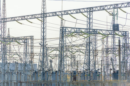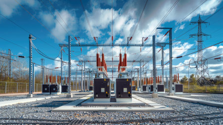 Captivating image of a modern industrial power station showcasing high voltage equipment under a cloudy sky, emphasizing energy infrastructure and urban technology.