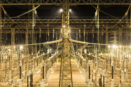 electricity transformation center, power station, electricity distribution point, electricity network, sunset sun rays, horizontal