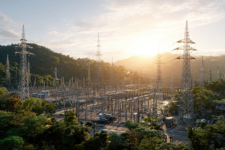 Lush greenery surrounds a sprawling power grid during a sunrise, highlighting electrical infrastructure