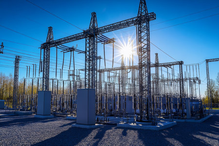 High voltage power substation with transmission lines and modern equipment under blue sky