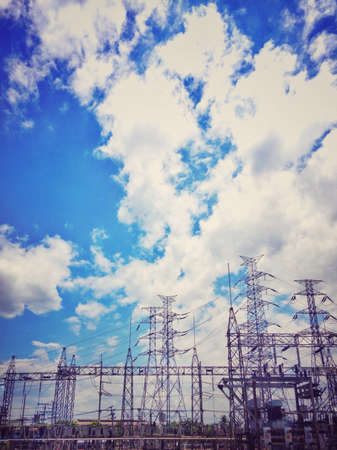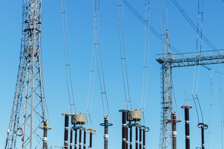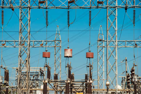 Outdoor High Voltage Electricity Power Station, Clear Blue Sky
