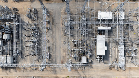 An aerial perspective reveals a vast electric substation filled with intricate power lines and electrical equipment in an urban setting, showcasing energy infrastructure.