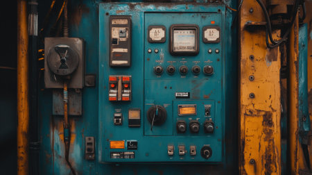 This image features a vintage electrical control panel showcasing an array of buttons and switches. The worn appearance against a rusty background adds character, capturing the essence of outdated technology and industrial charm.