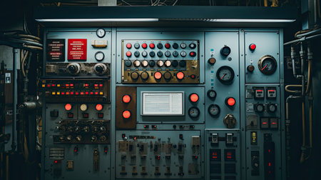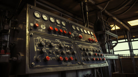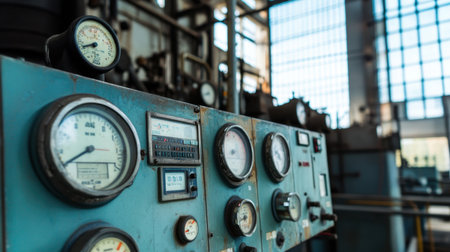 Detailed view of a vintage control panel featuring analog gauges set in an industrial workspace, showcasing the unique aspects of machinery and engineering.