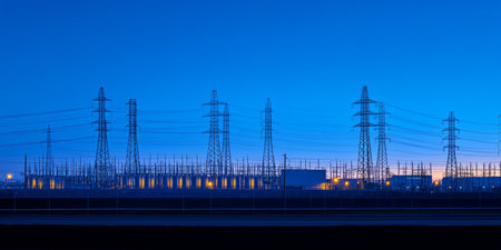 Industrial Power Grid at Dusk, Featuring Electrical Towers, Substations, Vibrant Sky.
