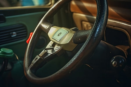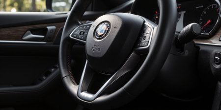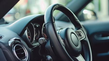 A detailed close-up of a cars leather steering wheel with visible stitching and texture, highlighting luxury and craftsmanship, with subtle lighting emphasizing