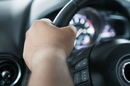 Unrecognizable male driver using left hand grabs on the steering wheel while driving on the road, man driving a car. Beautiful sunlight on the road during man drive a car. Safety driving concept.