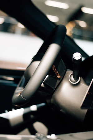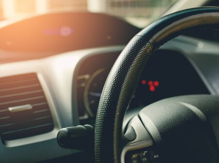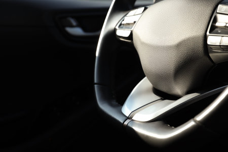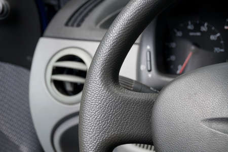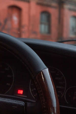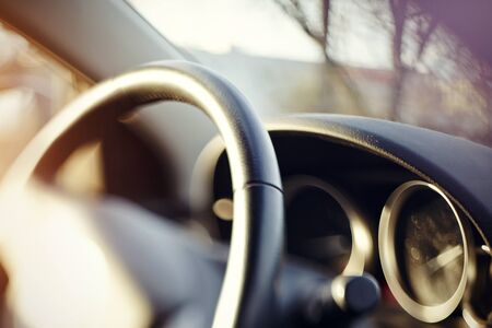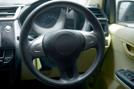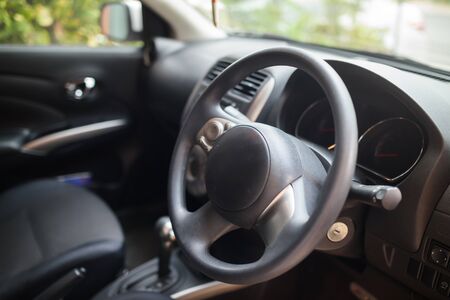 Car steering wheel. vehicle interior. Interior view of car with black salon.