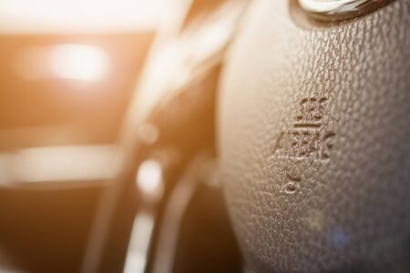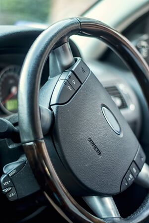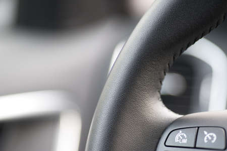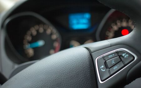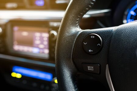 Steering wheel with audio equipment on modern car dashboard background. Selective focus.