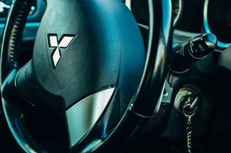 Mitsubishi vehicle. Highlight the steering wheel of the car with the company logo. russia - feb, 2020.
