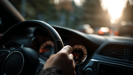 Driver navigates city streets during golden hour in a modern car capturing the essence of urban life and adventure on the road ahead
