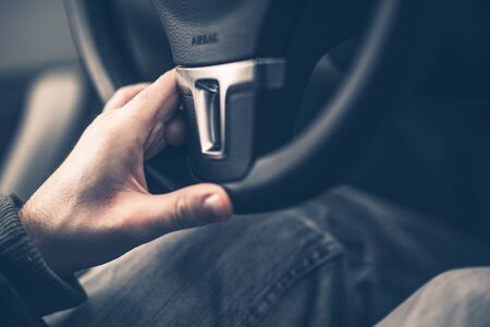 Performance Vehicle Caucasian Driver. Hands on the Steering Wheel. Automotive Theme.