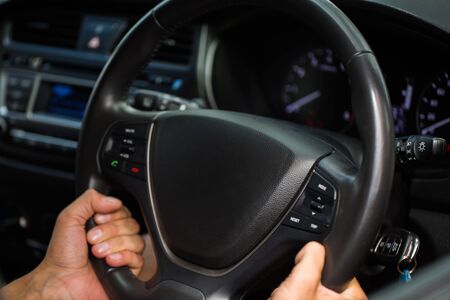 Close-up of a male hand on steering wheel in a modern car in Peru.