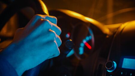 Close-up Of Man Hands Holding Steering Wheel While Driving Car ,Driving safety campaign, drunk Not driving With sunset