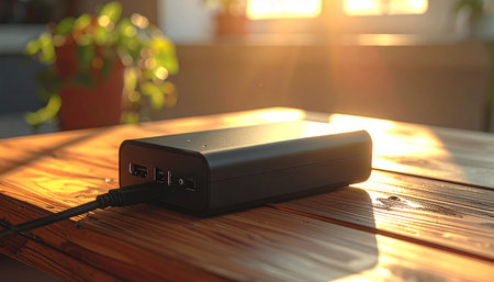 White power bank charging a device on a wooden table with a cable nearby
