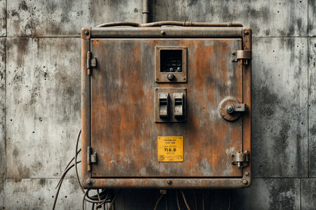 Close-up of abandoned rusty electric power distribution box on dirty textures wall in industry building. Backdrop of electricity meter on ruined filthy wall. Concept of old equipment. Copy text space