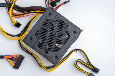 a powerful new computer power supply with connection cables on a white background