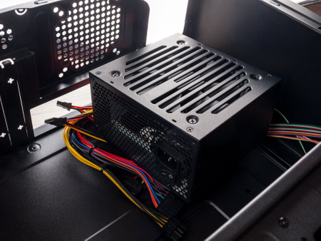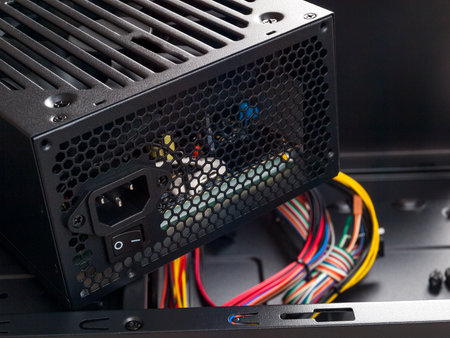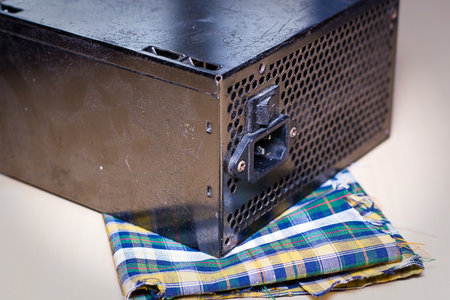 Computer part for system unit assembly, power supply for computer close-up, choice of quiet silent reliable power supply, close up