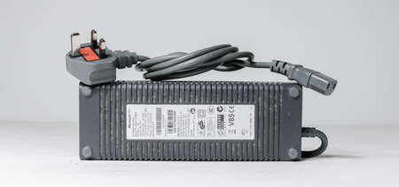 london, england, 05/05/20202 A slim line Microsoft xbox 360 elite ac power adaptor home arcade console isolated on a white studio background. Video game players, playstation vs xbox