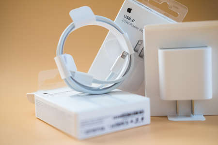 Bangkok - January 16, 2022 : Show package after unboxing the new Apple USB-C charging cable and charger provides 20W for iPhone. Close up