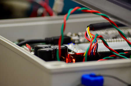 Close up photo of of electronics used in a lab to power a robot