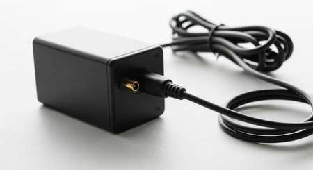 A close-up of a black power adapter brick connected to a coiled black electrical cord. The adapter and cord are positioned on a textured white surface, suggesting a workspace or electronic component display.