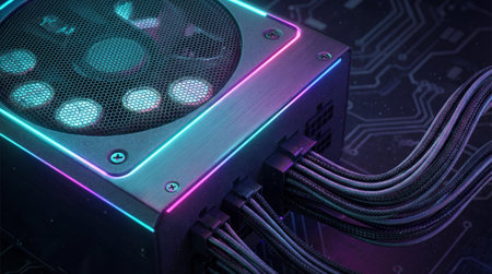 Close-up of a Shiny Computer Power Supply With Cables and Neon Lights Against a Motherboard Background