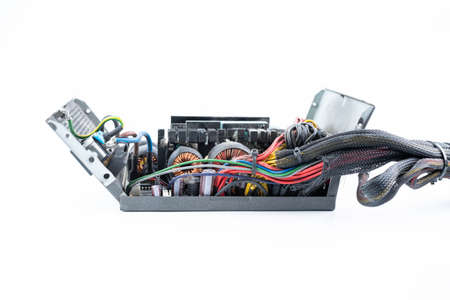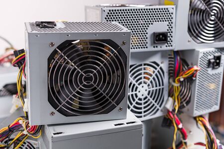 Computer power supply units heap. Metal box detail with rocker switch and colored cables. Discarded hardware spare parts with fan and electronic components. E-waste separation, recycling and disposal.