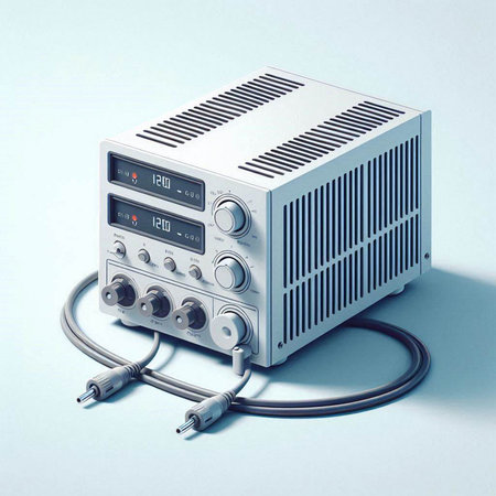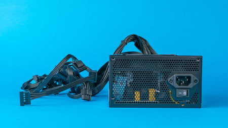 Computer Power Supply Unit with Cables on Blue Background in Modern Technology Context