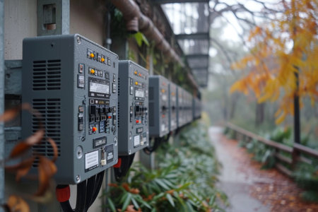 This image showcases an electrical power supply system featuring two batteries within a wall-mounted enclosure, highlighting essential wiring and connections.