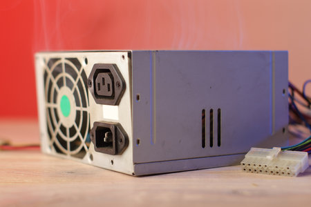 old computer power supply burning on the table and pink background