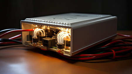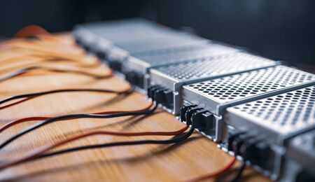 Close up of the metal mesh cases of power supply and wires are on a wooden table at the production of high-tech computers. Concept High Tech and Computer