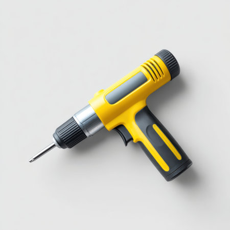 Close-up of a yellow electric drill against a blurred workshop background, showcasing tool detail and workshop vibe.
