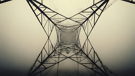 Foggy transmission tower under cloudy diffused light. Wide angle shot of steel lattice texture and energy grid.