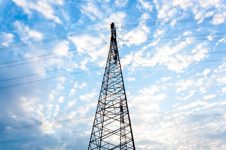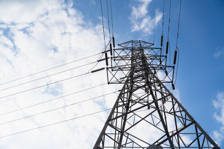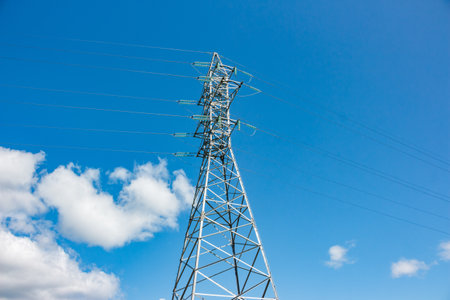 Imposing electricity pylon against a clear blue sky, with gentle clouds. Depicts power grid and modern energy transfer